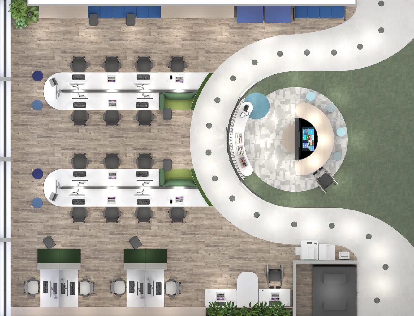 目の不自由な方のために手すりやベンチ、ソファを各所にデザイン。集中ブースは、精神に障がいのある方などが働き方を選べるように。らしさを活かしたデザイン設計も重視しています。