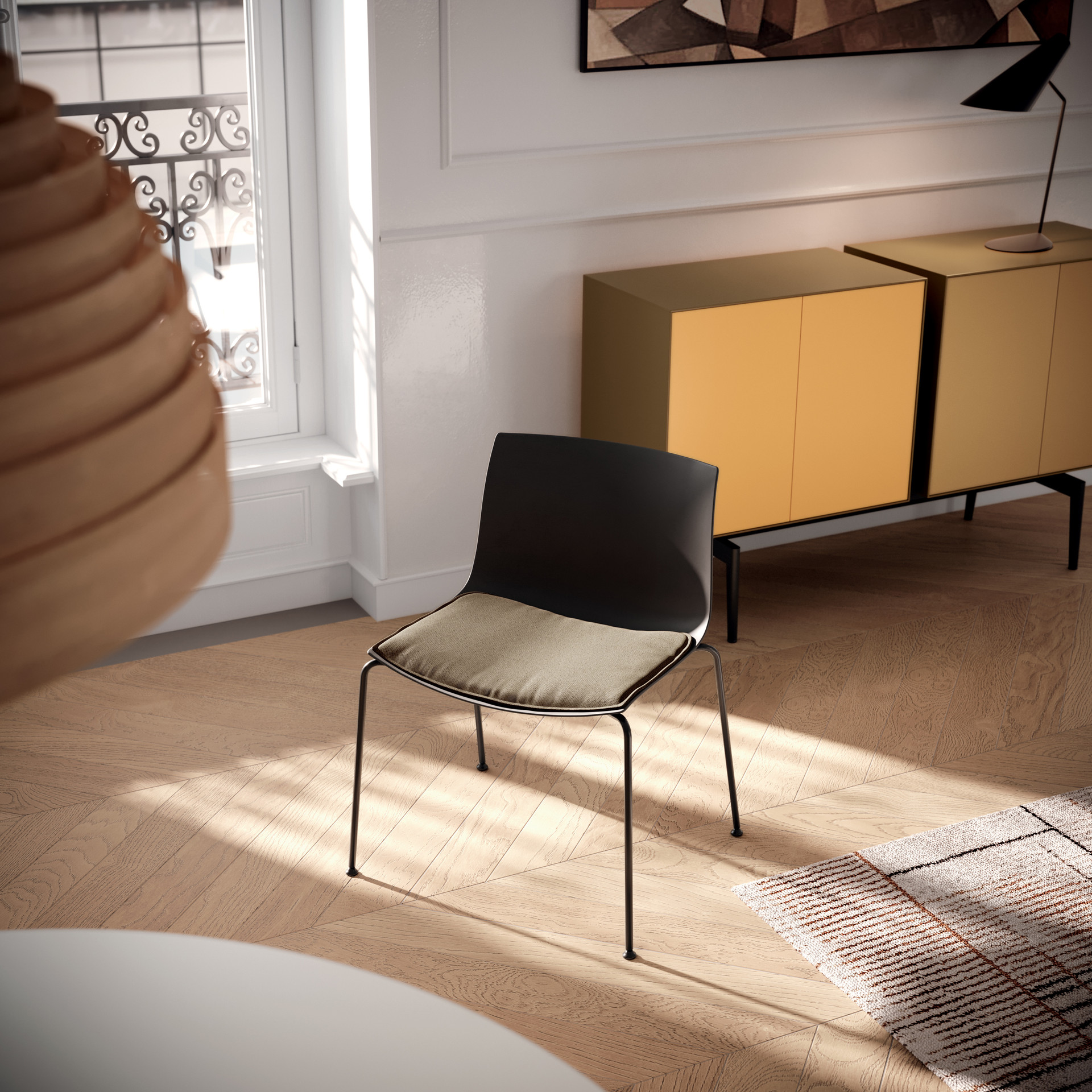 2001年に発表され、製品の環境負荷を評価する環境製品宣言を採用したアルペール初のプロダクトとなったCatifa 53は、外部との技術提携で素材を革新し、循環型ものづくり時代に向けて刷新されました。その代表作となるCatifa Carta は、製造時に出る不要な細材やチップなどから作られた革新的素材、ペーパーシェル(PaperShell)で再設計され、そのユニークな2曲面シェルが製品の独特なシルエットに不可欠な強度と座り心地の良さを可能にしています。この種のプロダクトとしては初の画期的イノベーションであるペーパーシェルは、CO2を吸収するという樹木の特性を生かすことで環境に及ぼす影響を劇的に軽減しています。 製品寿命の終わりには、土壌改良材にもなるバイオ炭に還元され、吸収されたCO2 を土壌に閉じ込め、大気中への放出を減らします。オリジナルの美しいフォルムとスタイルを維持しつつ、サステナブルプロダクトとしての先端的な基準を打ち立てます。