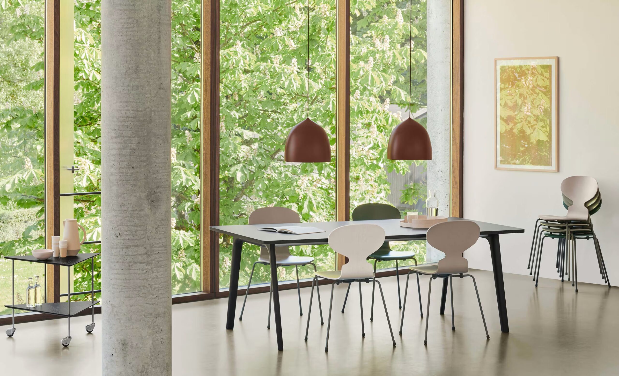 デンマークの建築家アルネ・ヤコブセンが1952年にデザインしたアイコニックなチェアです。アリのような独特のシルエットと、成形合板技術を駆使した軽量で耐久性のあるデザインが特徴です。持ち運びや積み重ねがしやすく、オフィスやカフェ、家庭など幅広い空間に適応します。カラーバリエーションや仕上げも豊富で、3本脚と4本脚のモデルが選べます。シンプルながらも洗練されたフォルムは、時代を超えて愛され続ける名作です。