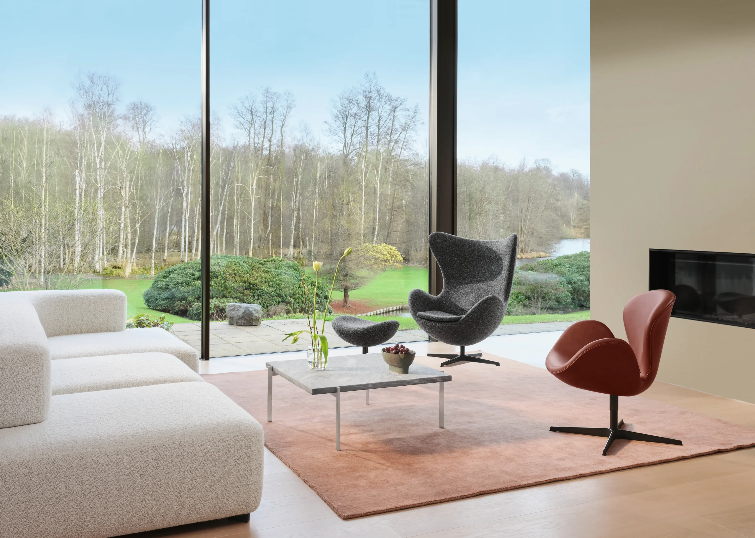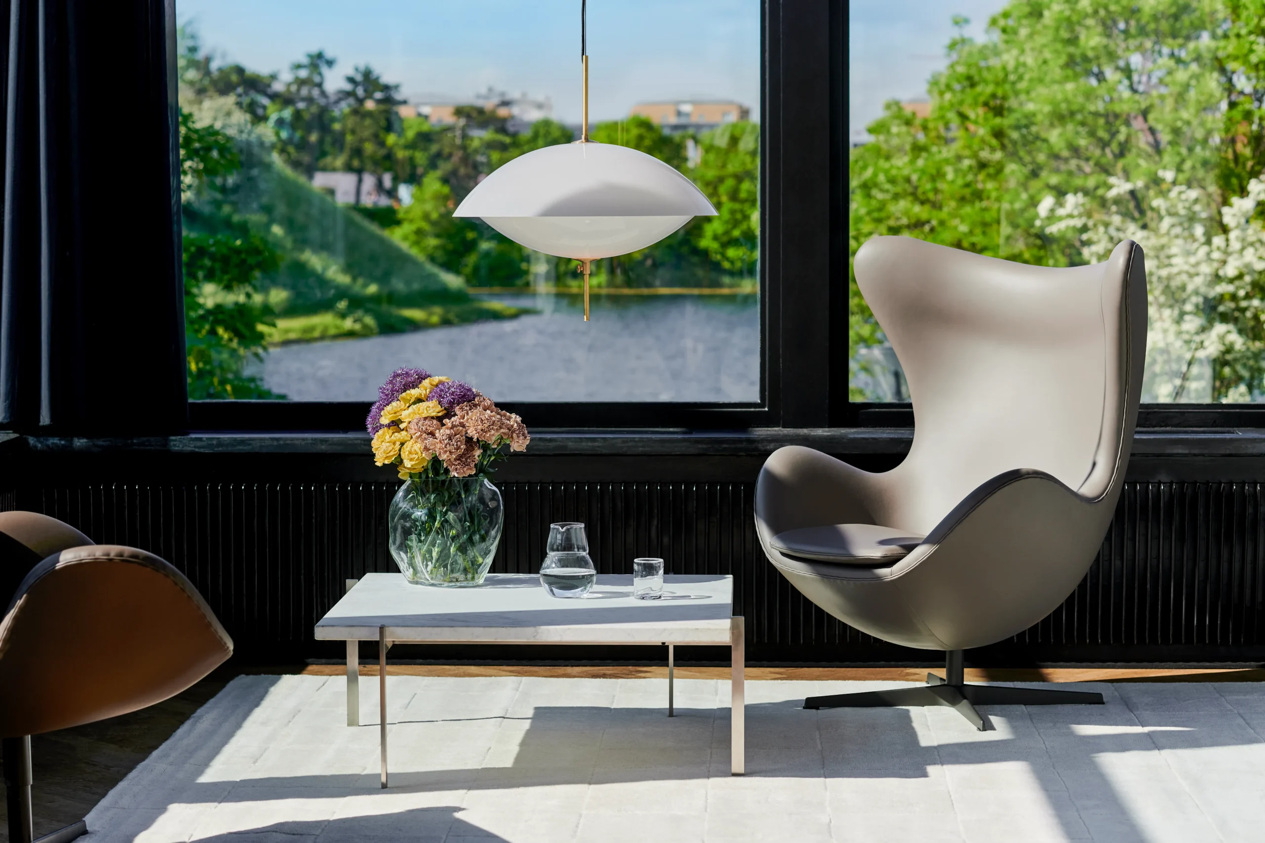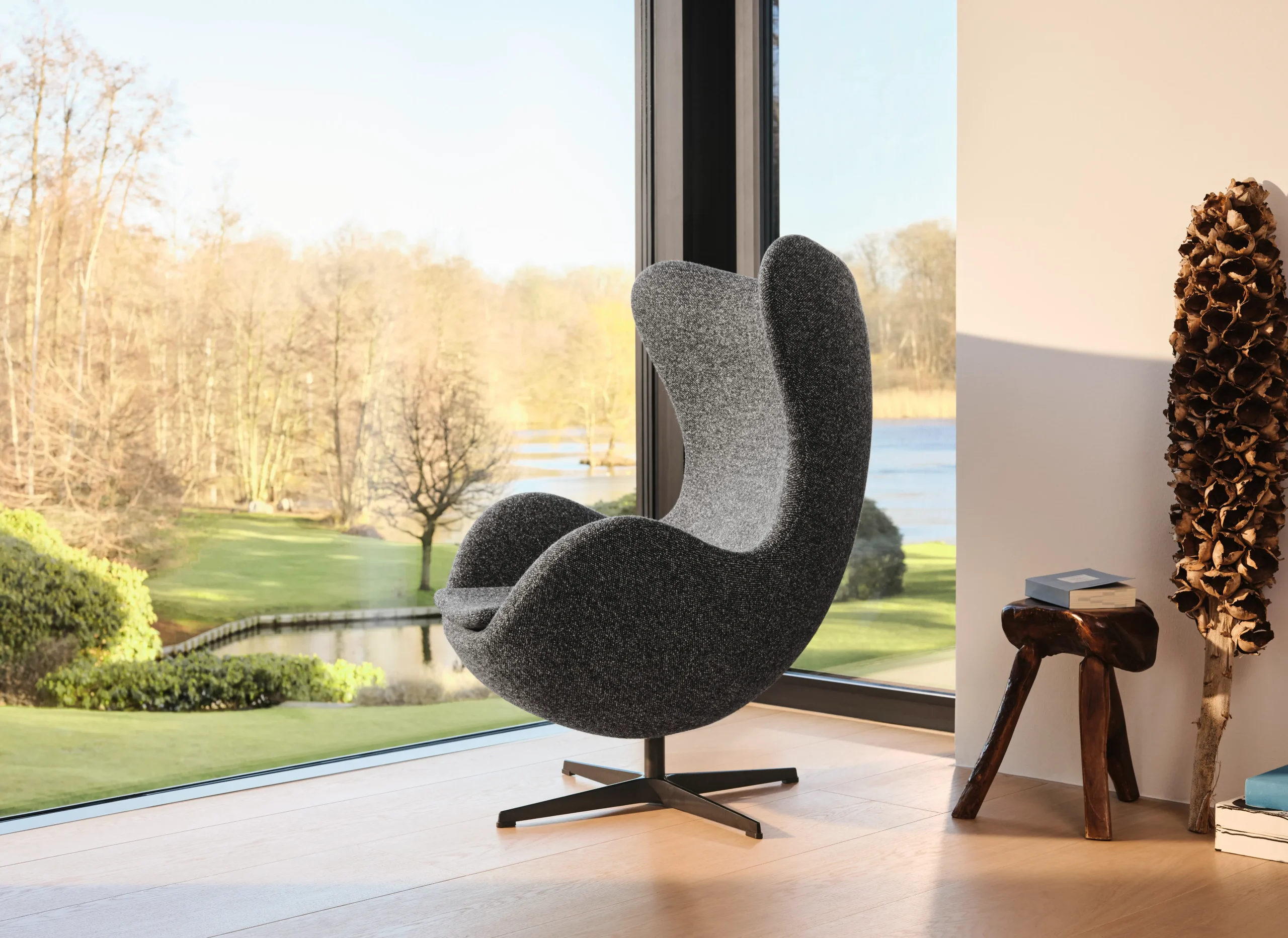 Egg Lounge Chairは、デンマークの建築家アルネ・ヤコブセンが1958年にデザインした、モダンデザインを象徴するラウンジチェアです。卵の殻を思わせるフォルムがプライベート感と快適さを提供し、高い背もたれと曲線的なデザインが優れた座り心地を実現します。360度回転するスイベル&リクライニング機能を備え、ウールやレザーなどの多彩な仕上げも選択可能。ホテルやラウンジ、住宅など幅広い空間に調和し、時代を超えて愛されるタイムレスな名作です。