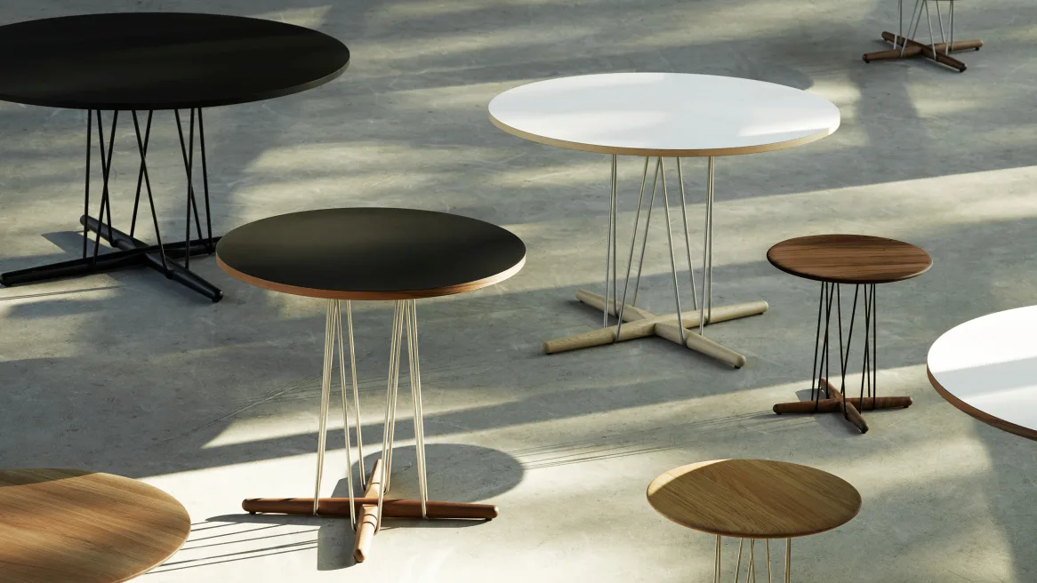 このシリーズの特徴は、木製フレームとスチールのディテールを組み合わせた軽やかなデザインにあります。天板の下に空間を持たせることで、視覚的に浮遊感のあるエレガントな印象を生み出しています。円形・長方形など多様なサイズ展開があり、ダイニングやワークスペース、ラウンジなど幅広い用途に対応。