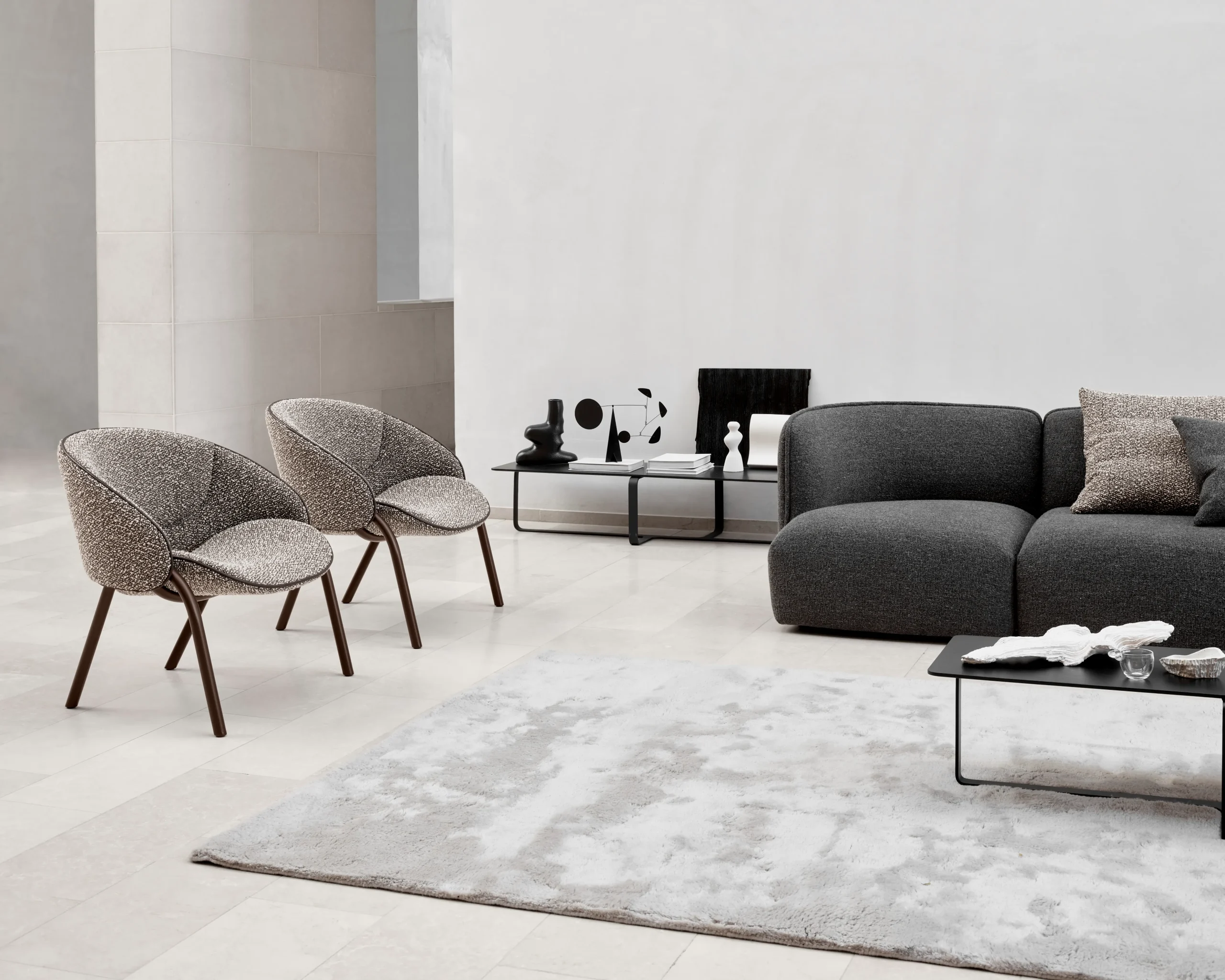 素材と仕上げ: フレームはプライウッド(合板)で作られ、座面と背もたれには高反発のポリウレタンフォームが使用されています。脚部はブラックまたはダークブラウンの粉体塗装スチールから選べ、座面の張地はファブリックやレザーから選べます。