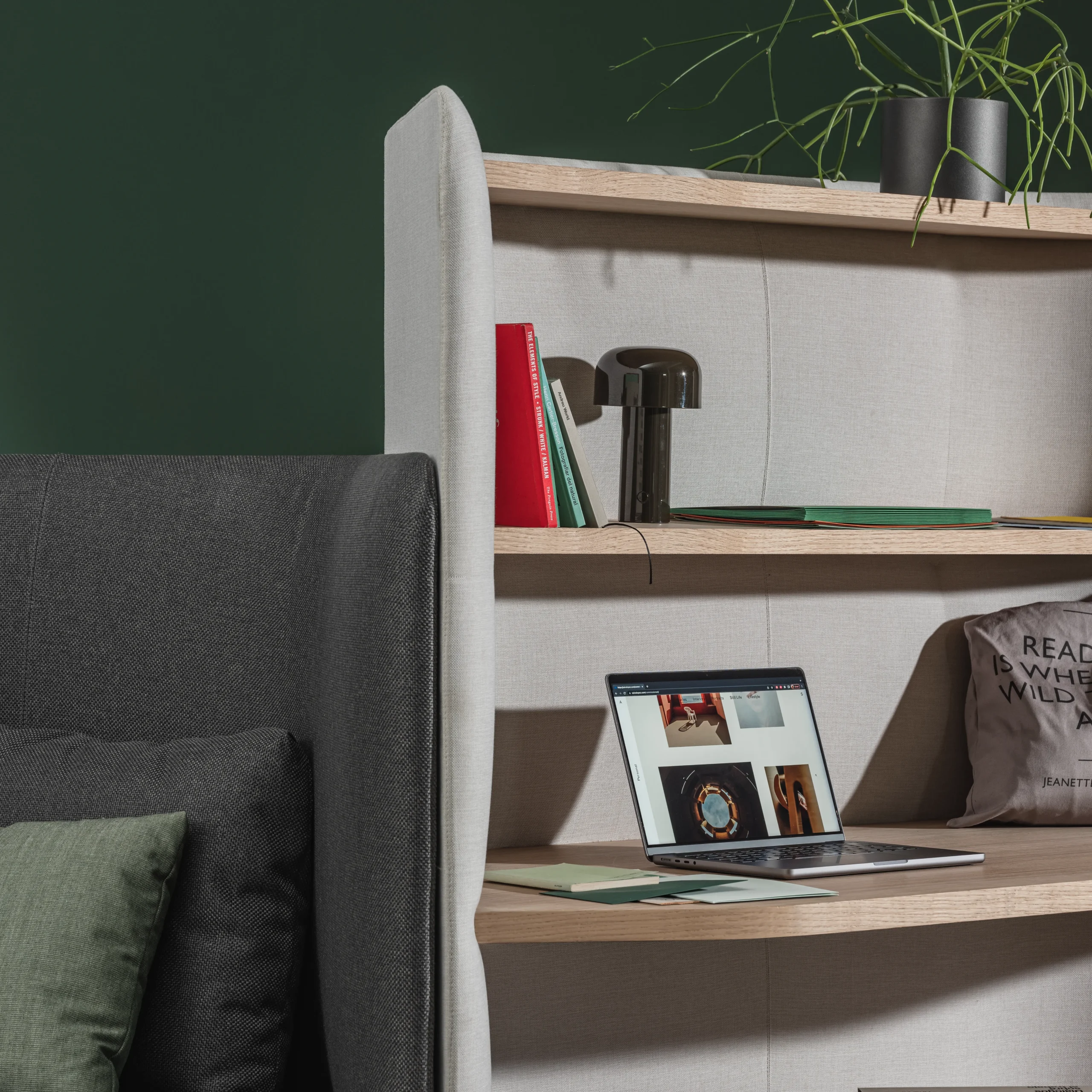また、モジュールのバリエーションも豊富で、車輪付き・車輪なしの選択が可能。背面のパネルやテーブルは、異なるファブリックでカスタマイズできるため、オフィスの雰囲気やブランドイメージに合わせたデザインが実現できます。さらに、現代のワークスタイルに欠かせない接続オプションも組み込めるため、快適さだけでなく機能性にも優れた空間を構築することができます。