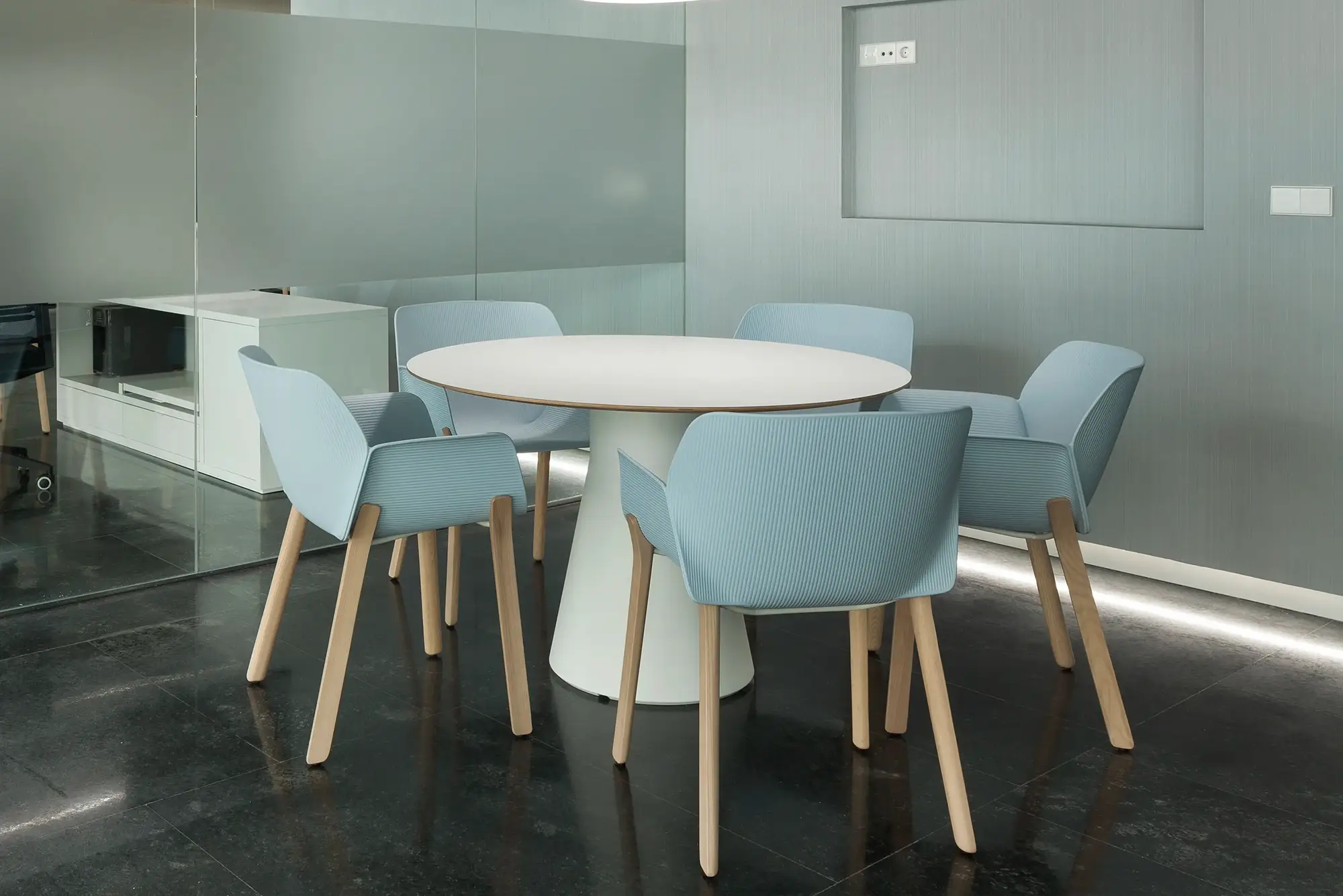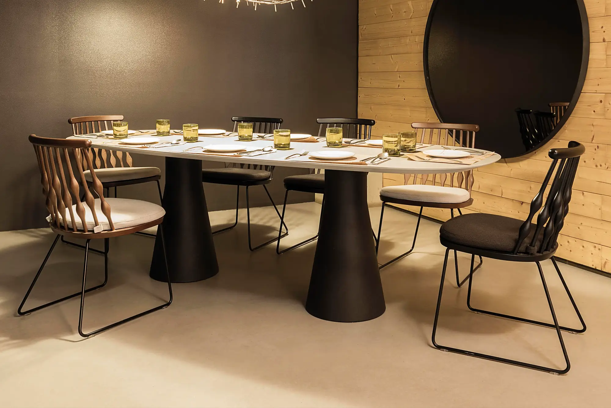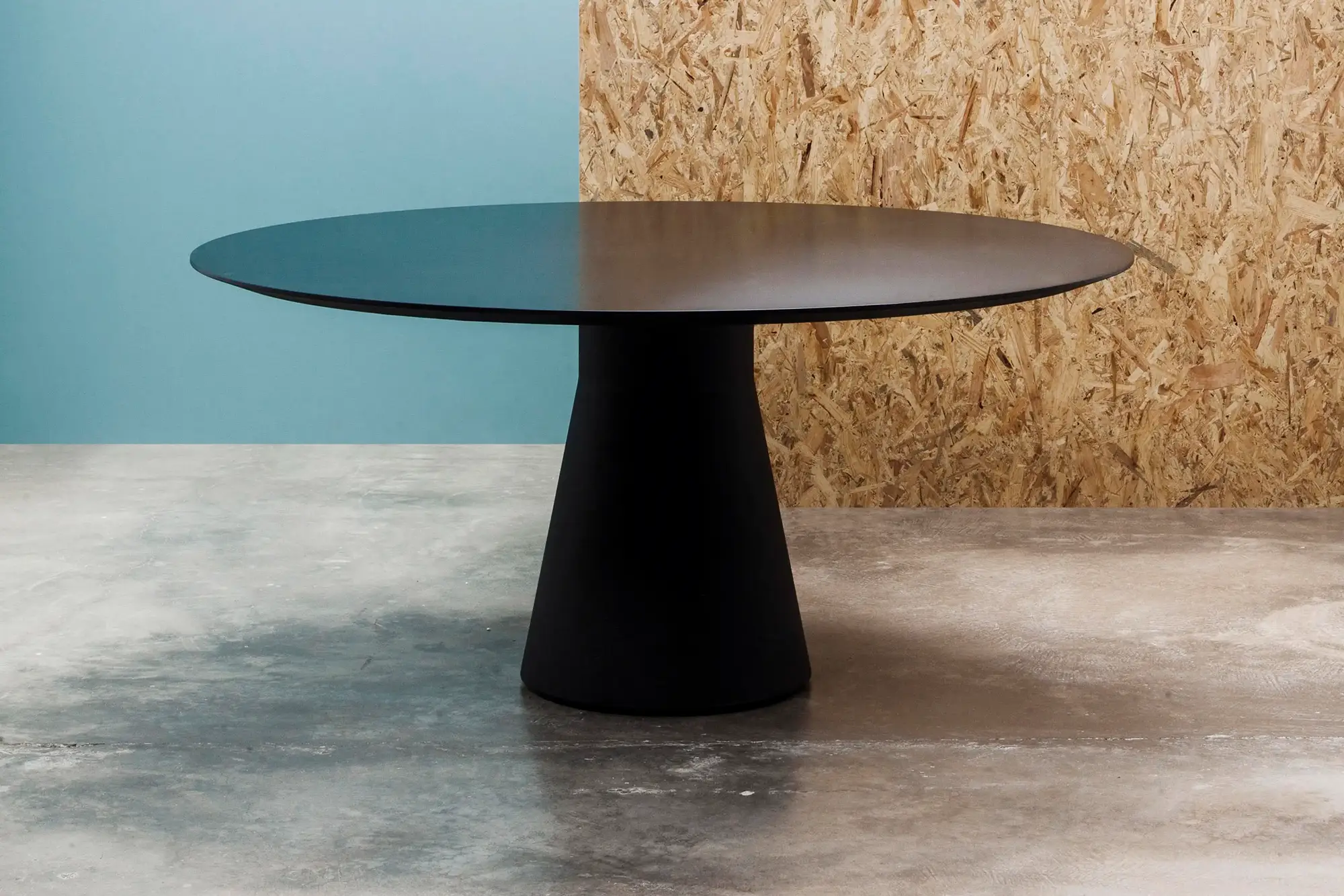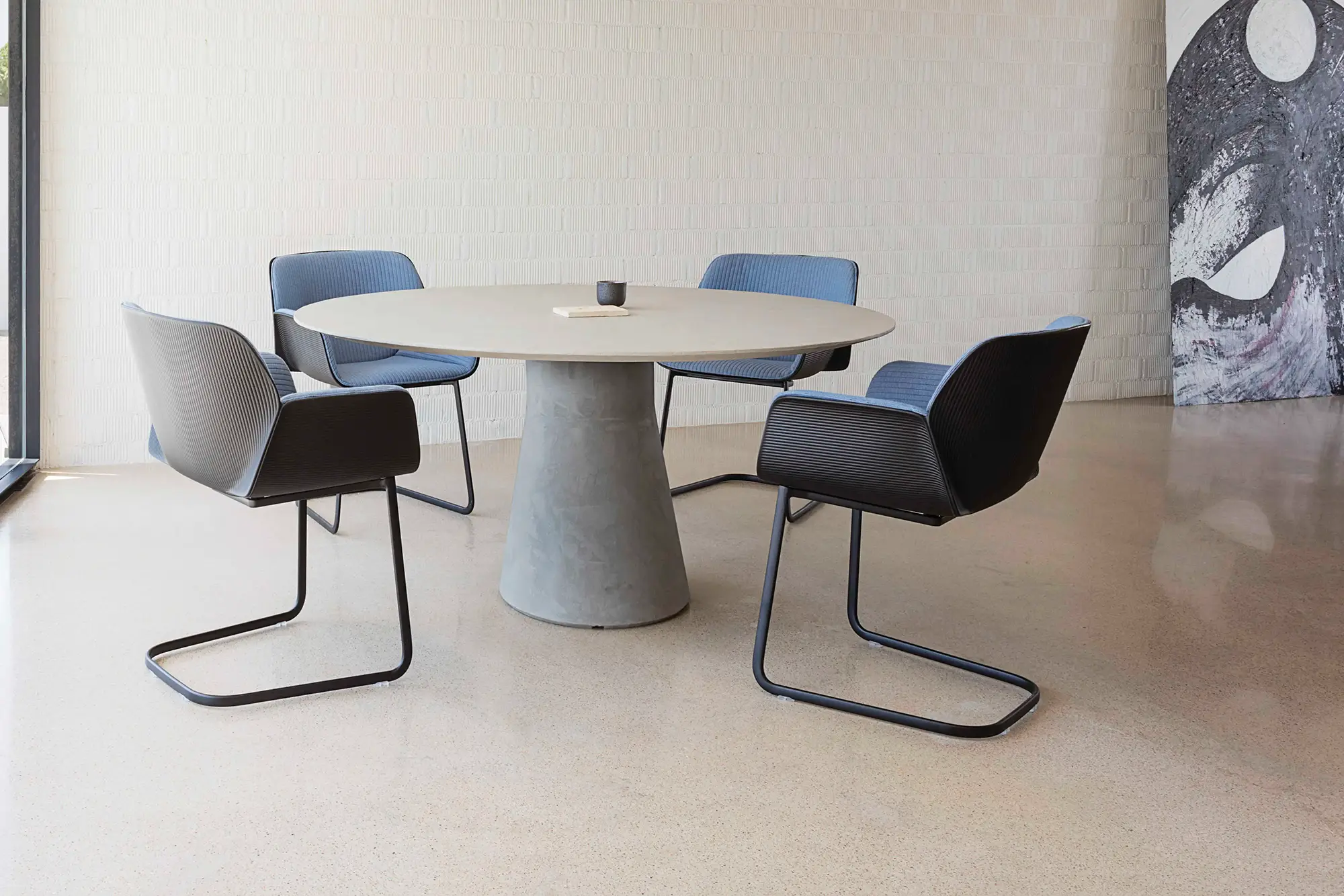 ベースのくびれた部分は彫刻のような見た目はエレガンスさと高い耐久性を体現しています。100%リサイクル可能なポリエチレン素材でできており、サイズバリエーションも多岐に渡ります。