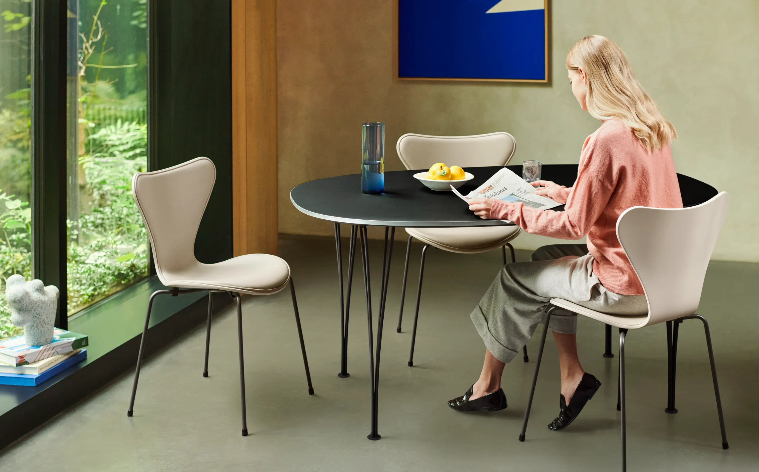 フリッツ・ハンセンのテーブルシリーズは、ピート・ハイン、ブルーノ・マテソン、アルネ・ヤコブセンによりデザインされたスーパー楕円、スーパー円、円形、長方形テーブルで構成されています。スーパー楕円テーブルのフォルムは、ストックホルムのセルゲル広場の交通問題に対してのデザイナーのピート・ハインの解決策であるラウンドアバウト(環状交差点)にインスピレーションを得ています。 椅子4脚がセットできる、B611モデルのスーパー楕円テーブル。明確な上座・下座が存在しないため、オープンで親しみあふれる集まりに最適です。 このテーブルはEUエコラベル(別名:EUフラワーエコラベル)認証を取得しています。この認証は、ライフサイクルを通じて環境負荷を最大限に考慮した製品であることを保証するものです。